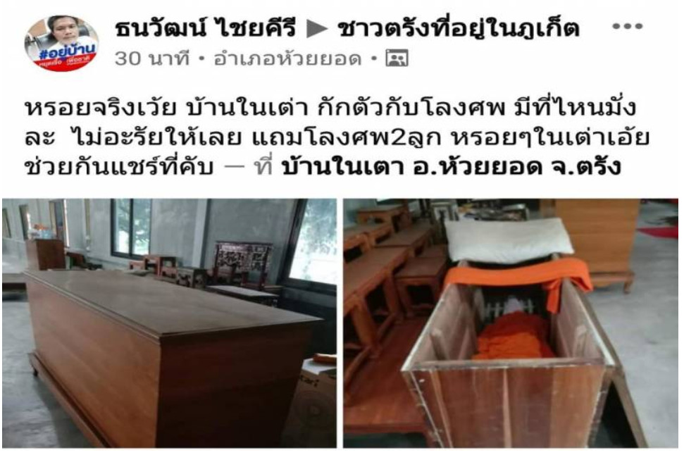 วันนี้ (อังคารที่ 12 พฤษภาคม 2563) ที่วัดถ้ำพระพุทธโกษีย์ (ในเตา) บ้านหน้าวัด ม.1 ต.ในเตา อ.ห้วยยอด จ.ตรัง ซึ่งเป็นจุดกักตัวเพื่อเฝ้าระวังป้องกันการแพร่โรคติดเชื้อโควิดสำหรับผู้ที่มาจากพื้นที่เสี่ยงประจำตำบลในเตา โดยใช้ศาลาที่พักสามเณรเป็นจุดกักตัว และตอนนี้กลายเป็นจุดสนใจเนื่องจากมีผู้ใช้เฟซบุ๊กรายหนึ่งโพสต์ว่า “บ้านในเตา กักตัวกับโลงศพ มีที่ไหนมั่งละไม่มีอะไรให้เลย แถมโลงศพ 2 ลูก” พร้อมภาพโลงศพที่อยู่ภายในห้องกักตัว